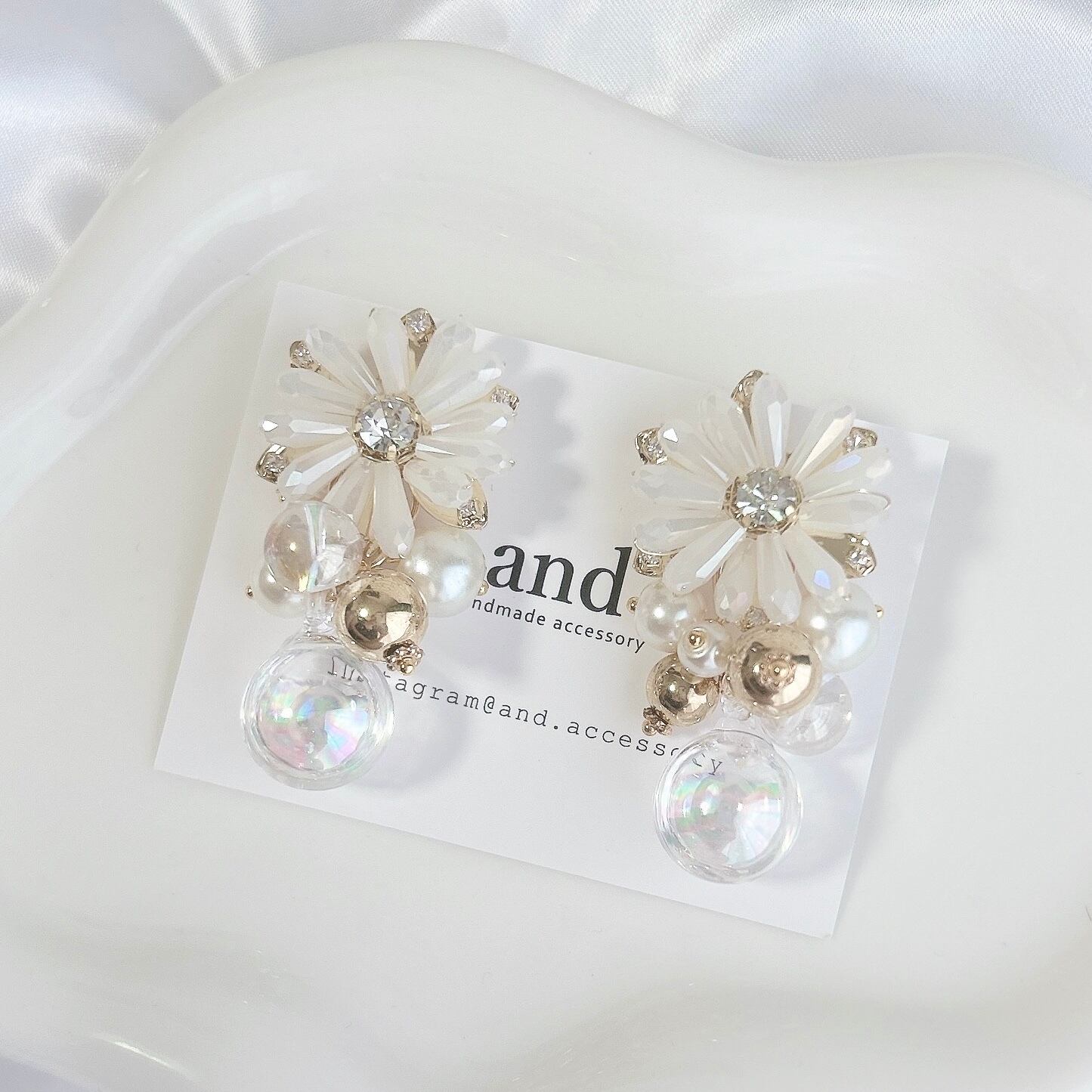 下の粒々した感じのパーツがとても可愛く、トップのbijou flowerとバブルは、光に当たるとキラキラ輝くのでお顔周りを明るく華やかな印象にしてくれます⟡꙳ガラスの中に液体が入っています。